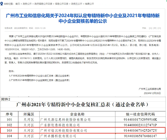 新年伊始,喜訊臨門!近日,廣東省工業和信息化廳公示了2024年度專精特新中小企業名單,廣州市銘漢科技股份有限公司再次通過認定,這無疑是對銘漢股份在科技創新、專業發展道路上的又一強有力的肯定。