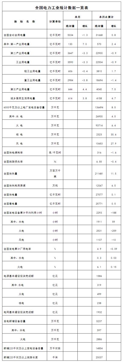 7月份,全社會用電量5034億千瓦時,同比下降1.3%。