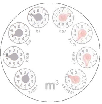 2、指針式水表讀數:指針式水表是十進位累進計數,以家庭用水表為例水表指示數有個、十、百、千四位數(黑色指針),計算單位為立方米(噸),立方米以下有1/10、1/100、1/1000、1/10000四位數(紅色指針),如下圖: